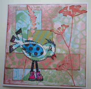 Volgens mij kan ik de komende jaren heel veel kaartjes versturen. Er zit even geen rem op op dit moment. Ik geniet weer volop van het gefreubel en alles wat ik heb. Hier weer een gelli plate achtergrondje en daarop wat extra papiertjes en een stempelafdrukje. Ook nog twee bloemen gestanst. En dan is dit het eindresultaat, en hij gaat weer in de doos bij alle andere maaksels van de laatste tijd.